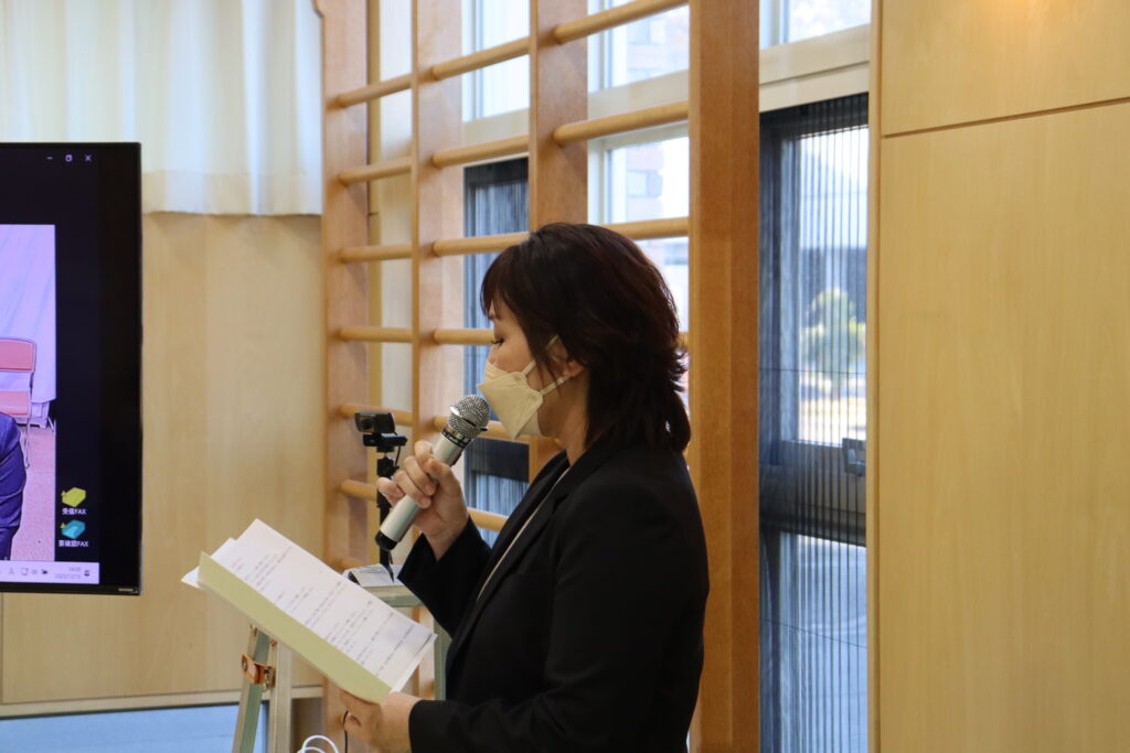10年表彰代表者による、謝辞の様子。(みょうばなの杜はオンライン中継により参加。)