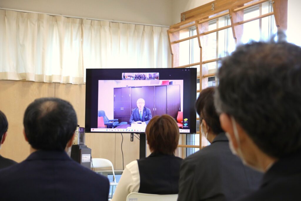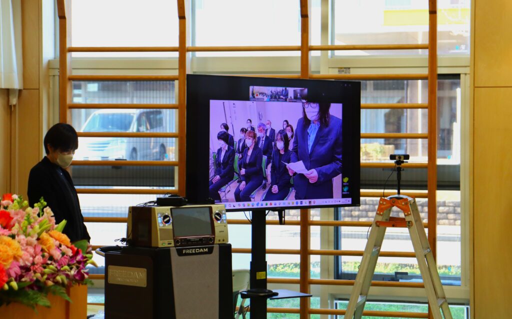 湖山理事長はオンラインで参加。祝辞をいただきました。
