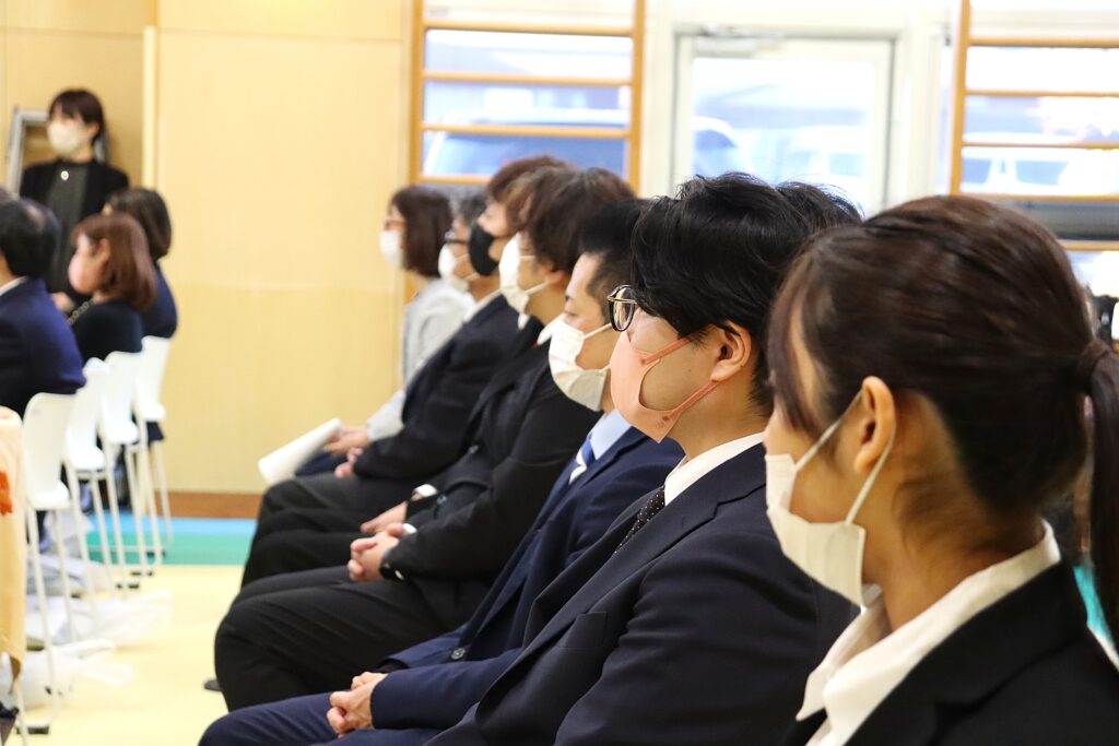 理事長の祝辞をみな真剣に聞いています。節目を迎えた職員は、次の5年への決意を新たにしました。